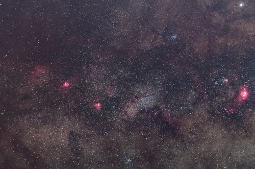 いて座は星の密集度の高く、双眼鏡や望遠鏡で見ると「ヒュー」とついため息が出ます。取分けスタークラウドの星々のキラキラ度合いは格別だなと感じます。天体写真でのスタークラウドは別名「バンビの横顔」と呼ばれてますが、IRブロックフィルターを外した…
