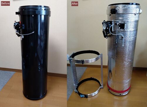 反射鏡筒の結露防止をドライエア方式で長年通用していたが、先日の低温高湿度では斜鏡も霜でベットリとなり撮影できなくなった。今までドライエアで完璧かと云うと、酷い場合は実際は斜鏡や主鏡は無事でも、鏡筒内壁は露ベッタリとか霜バリバリになった事も…