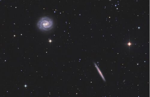 NGC3501は右下の真横になった銀河、左上のほぼ正面を向いた銀河はNGC3507で、このNGC3507はNGC3501の伴銀河だそうだ。写真での見た目だと似たような大きさで、とても伴銀河とは思えない。調べてみると2つの銀河は1200万光年も離れていて、それぞれの大きさ(…